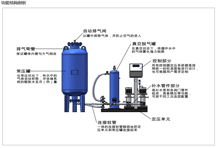 1、自動定壓,自動補水,自動泄水,自動脫除系統內游離氣體,溶解氣體。