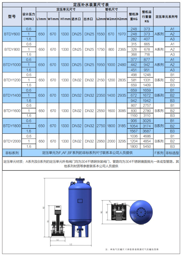 暖通空調系統中由于水溫度的變化以及不可避免的水滴泄露從而造成系統的壓力不穩,導致系統無法穩定運行。BTDY系列定壓補水裝置可自動監測系統壓力,系統壓力較高時,通過氣壓罐膨脹穩壓,系統壓力降低時補水泵自動開啟向系統補水直至系統壓力達到設定壓力值時水泵自動停止,周而復始實時監測確保系統壓力穩定運行。